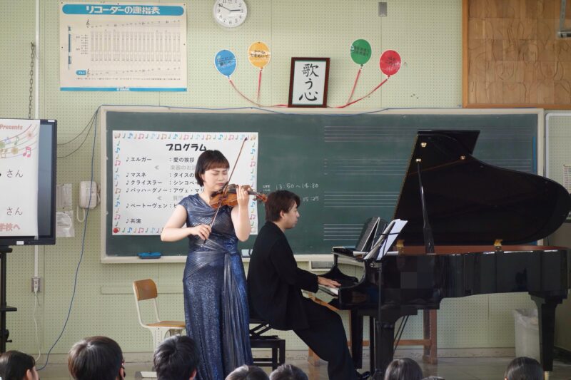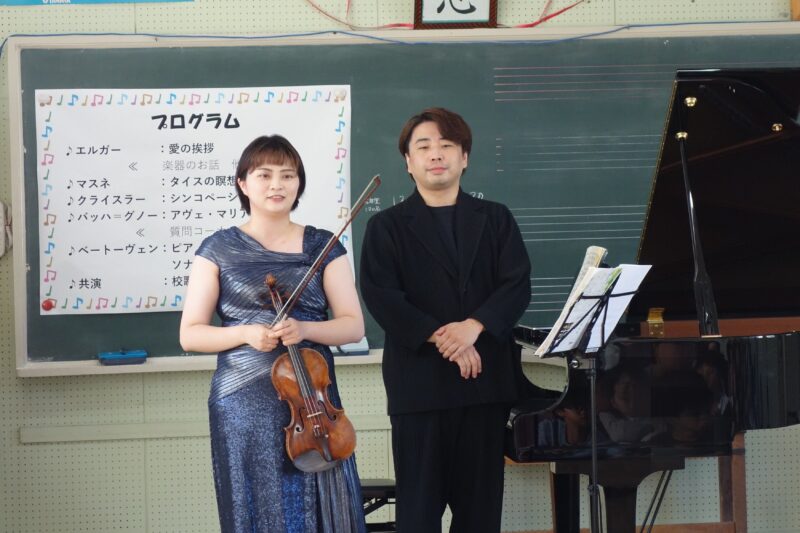 | 5. 曲 目 | エルガー:愛の挨拶 ≪ 楽器のお話 他 ≫ マスネ: タイスの瞑想曲 クライスラー: シンコペーション バッハ=グノー: アヴェ・マリア ≪ 質問コーナー ≫ ベートーヴェン:ピアノとヴァイオリンのためのソナタ第9番『クロイツェル』第3楽章 共演曲:校歌1番 |