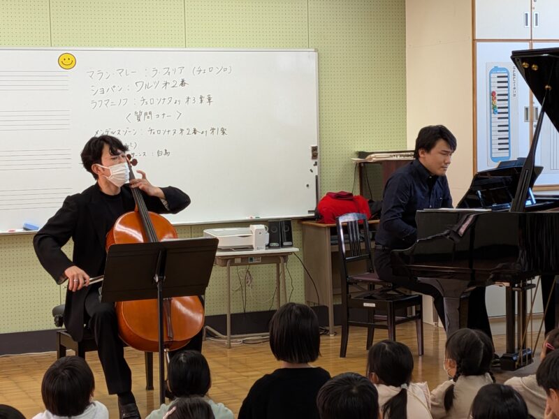 マラン・マレー:ラ・フォリア チェロソロ ショパン:ワルツ第2番 ピアノソロ ≪ 楽器の紹介 他 ≫ ラフマニノフ:チェロソナタより 第3楽章 ≪ 質問コーナー ≫ メンデルスゾーン:チェロソナタ第2番より 第1楽章 アンコールとして サン・サーンス:白鳥 |